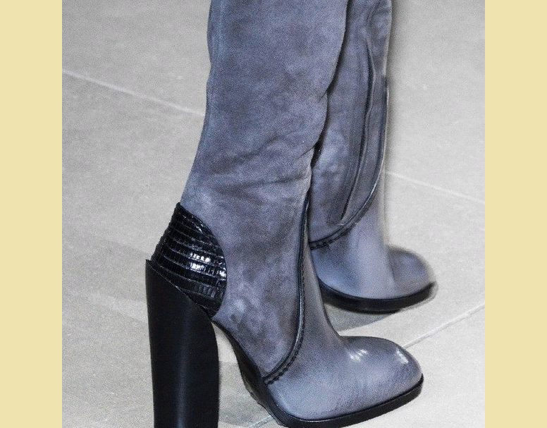 <>Масивний і стійкий каблук плавно «перетікає» в області п’яти. Сіре амбре на квадратному лаковому шкарпетці, замша на халяву, тонка підошва і каблук з п’ятою іншого кольору і матеріалу — це справжня плутанина, але виглядає екстравагантно і привертає увагу.