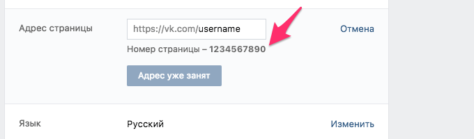Якщо на вашій сторінці замість цифрового ID показується англійський текст, то це означає, що для вашої сторінки вже встановлений красивий адресу. У будь-якому випадку, цифровий буде показуватися в налаштуваннях.