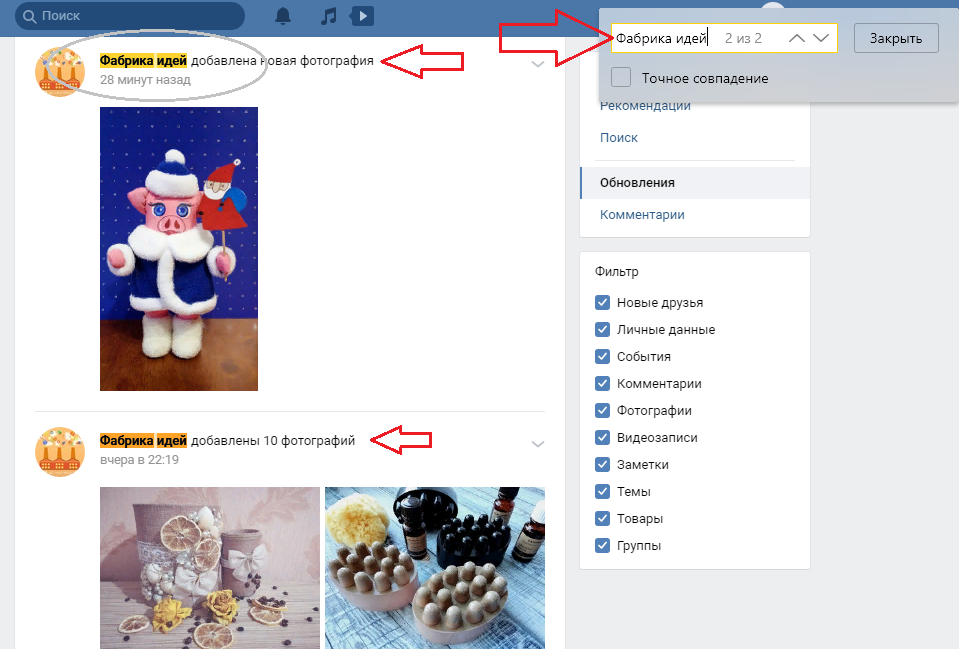 - З’явиться пошукове вікно, введіть ім’я друга або назву групи і у ваших оновлення будуть показані користувачі або співтовариства, якщо їх оновлення присутні в стрічці.