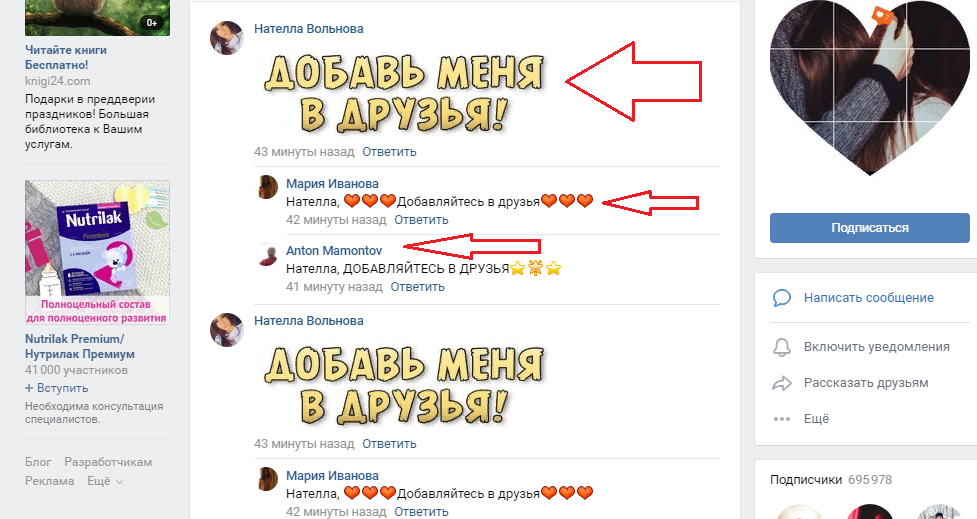 У таких групах люди розміщують оголошення з проханням додати їх в друзі. Сміливо додавайте себе до таких людей — виконайте їх прохання і ви додасте нових друзів.