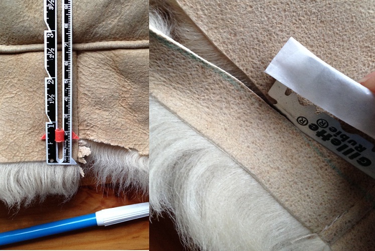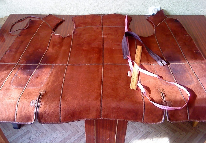 - Розпороти всі деталі між собою. Робіть це акуратно, щоб не пошкодити шкіру. Якщо ви не просто ходите декорувати або злегка переробити дублянку, тоді потрібно обов’язково розпорювати кожен шматочок. Адже так ви побачите, що малі, загнуті або зіпсовані шматки стають непридатними. А значить – їх потрібно замінювати матеріалом з іншого дублянки або іншими шматками зимового матеріалу.