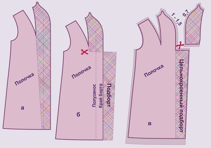 - Хочете зробити модний виріз за типом косухи – вточите відрізані деталі до нинішніх місцях застібки і замініть на новомодний комір. Нижче пропонуємо більш докладний опис.