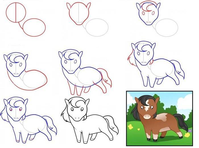 Малюнки олівцем поетапно складно робити навіть дорослій людині, а для дітей це взагалі важко. Тому ви можете зобразити на папері просту красиву конячку, а розмальовку тваринного різними кольорами доручити малюкові. Спільна творчість завжди дуже зближує дорослого і дитини. Малювання корисно для розвитку дрібної моторики, тому частіше займайтеся ним з малюками.