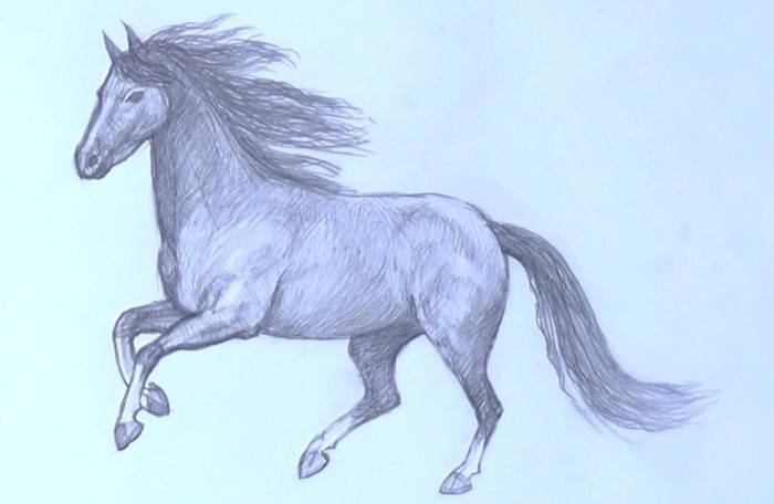 - Подаруйте коні на своєму малюнку шикарну развевающуюся гриву і хвіст. Всі контури зітріть, вони вам більше не знадобляться. Додайте тіні. Зараз ви знаєте, як поетапно намалювати коня, яка стрибає.