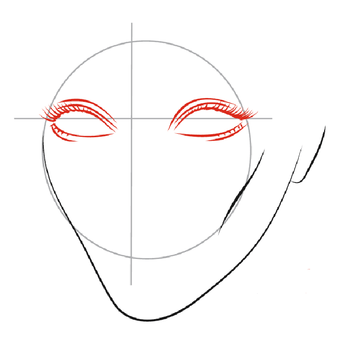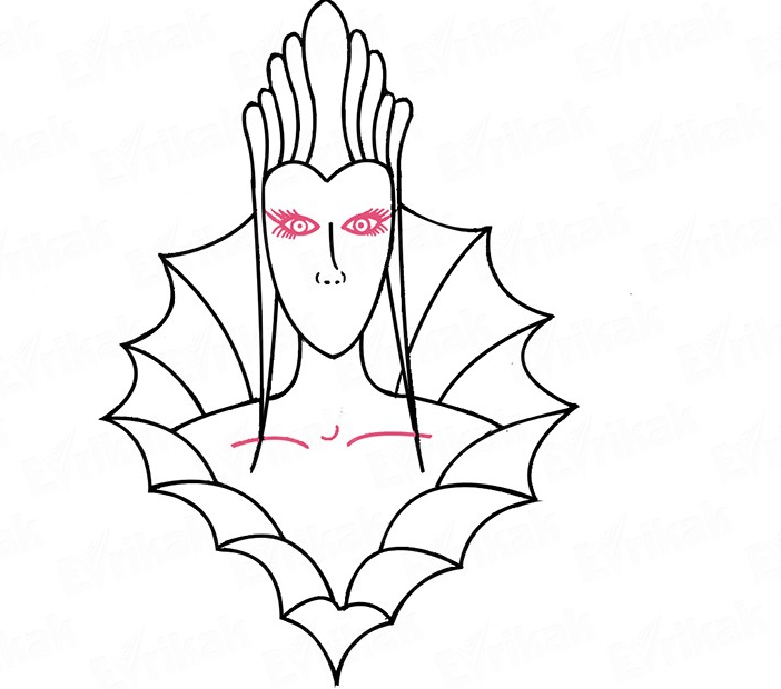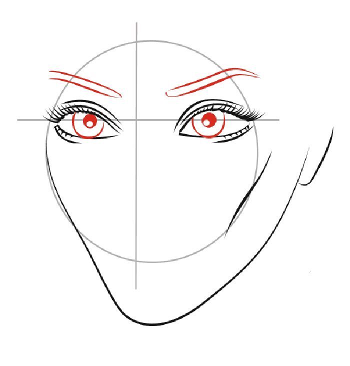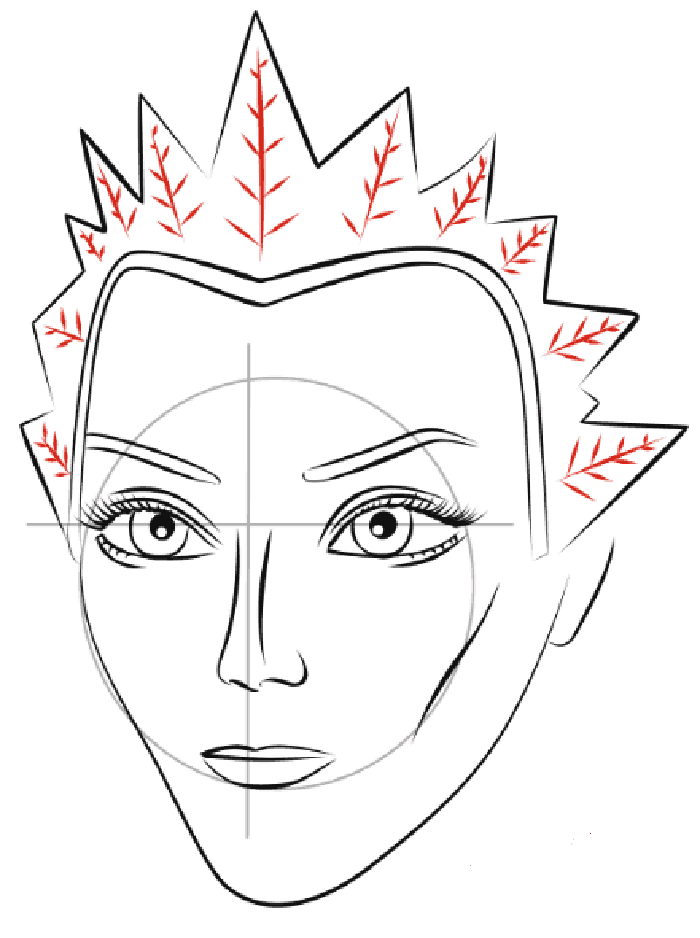 - З допомогою допоміжних ліній робимо начерки строгих очей королеви.
