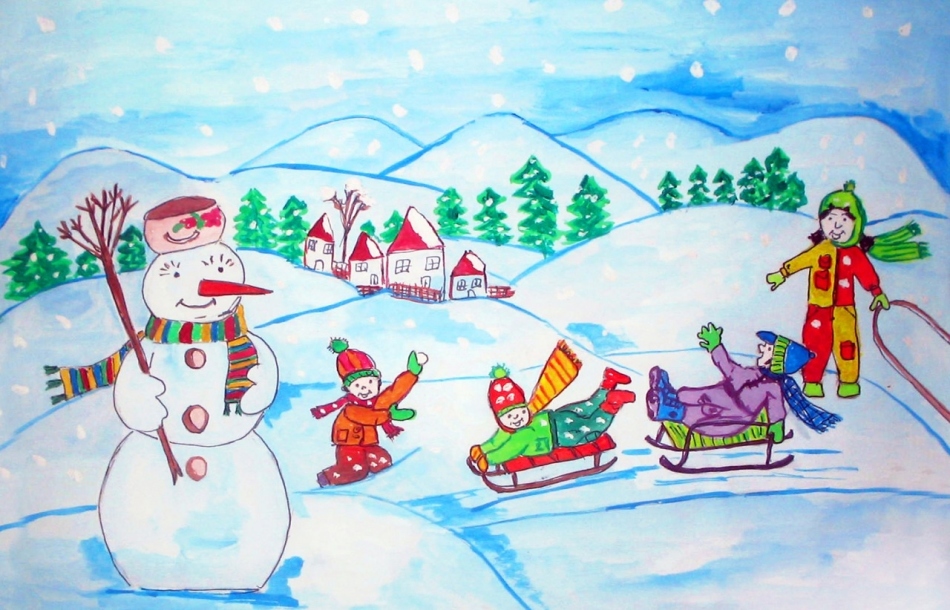 Прикрасити малюнок із зображенням зими можна доповнити веселою дітворою. Такий малюнок обов’язково буде викликати приємні емоції та асоціації з дитинством. Така ідея так само хороша для малювання новорічних листівок і картинок для конкурсів і виставок.