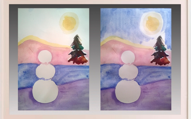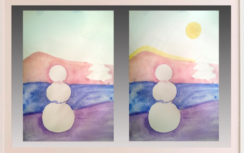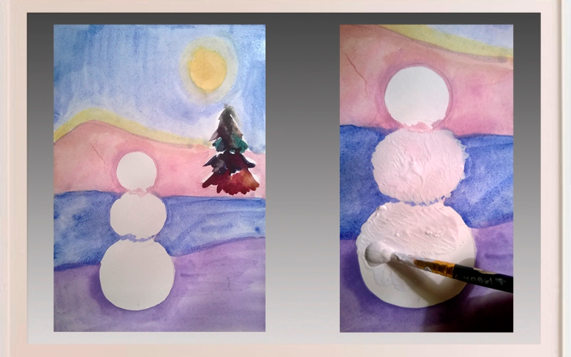 - Тонуємо блакитною фарбою: тіньові сліди від тіла сніговика, близько ручок, поруч з носиком.