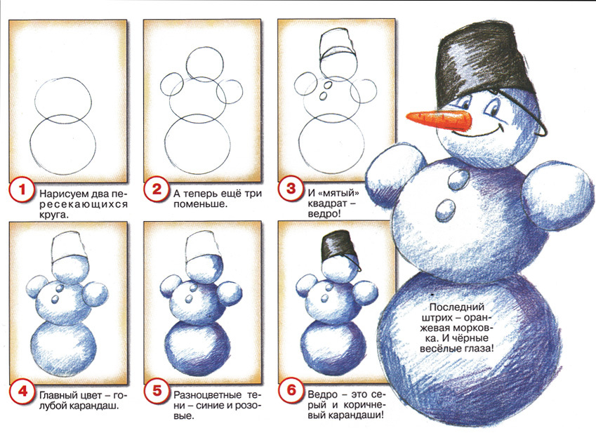 Такого забавного і веселого снігового героя виявляється можна намалювати різними способами.