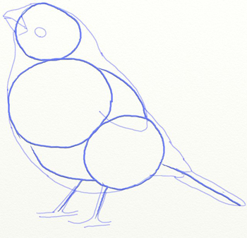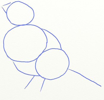 - Переходимо до нижньої частини контуру птиці. Тут нам потрібно провести пряму лінію і намітити двома штрихами лапки. Додамо нашим колах форму пташиного тіла: обведемо попередні контури тулуба поверх кіл. Намітимо короткою лінією хвіст.