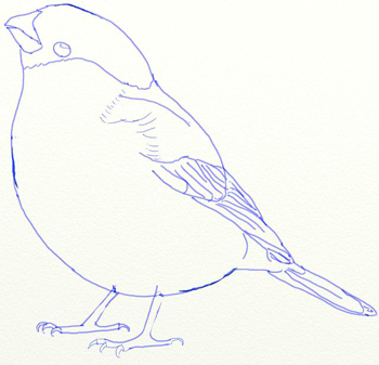 - Починаємо малювати третього снігура. Знову малюємо спочатку голову, потім наводимо контур спинки, малюємо крило, дзьоб. Наносимо контури третьої пташки більш детально. Малюємо хвіст, опуклу грудку, намічаємо невеликий зігнутою лінією друге крило.