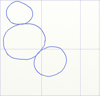 - У лівій половині аркуша намалюємо три кола. Вони допоможуть нам промальовувати загальний контур снігура. Овал, який знаходиться в середині, зробимо найбільшим.