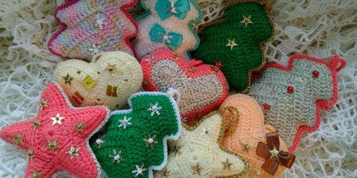 З допомогою спиць або гачка виконуються сніжинки, сніговики, зірки, казкові персонажі. Крім готових схем в’язаних іграшок, можна спиратися на свою фантазію. Є ідеї прикрас з матеріалів всіляких відтінків і фактур ниток.