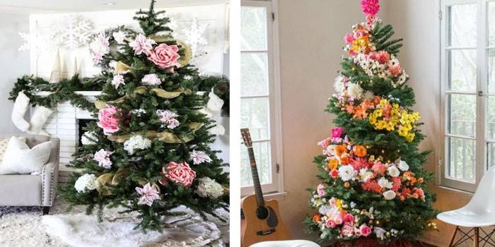 Нові і незвичайні дизайнерські ідеї в інтер’єрі передбачають прикраса новорічної ялинки квітами.
