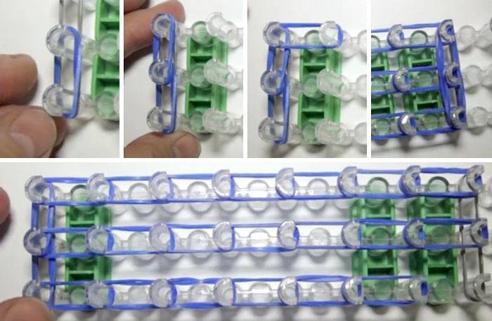 • Для роботи використовуються завжди по дві резиночки, а верстат налаштовуватися так, щоб середній ряд був трохи зрушений вперед.