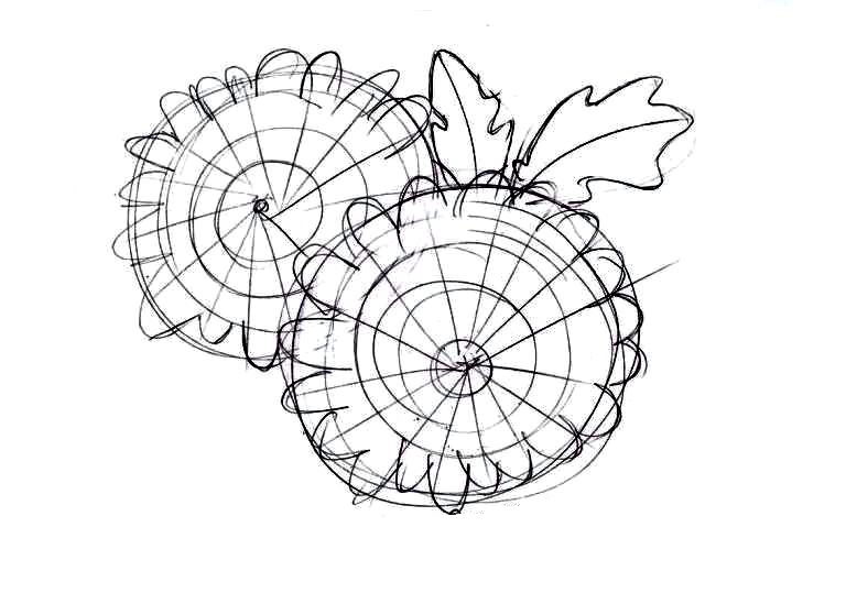 - В центрі кожного кола поставте умовну точку і, орієнтуючись на неї, проведіть ще кілька внутрішніх кіл. На аркушиках проведіть центральну лінію, що визначає черешок листа хризантеми