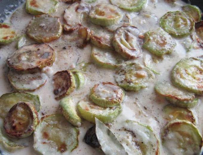 5. Тушкуються кабачки 10 хвилин, потім до них додається сметана і протушивается ще пару хвилин
