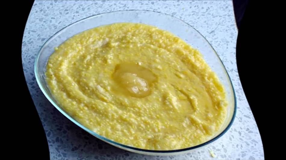 Кукурудзяну крупу зварити на молоці або на воді (на молоці смачніше) з розрахунку крупа 1 частина, молоко (вода 4 частини)