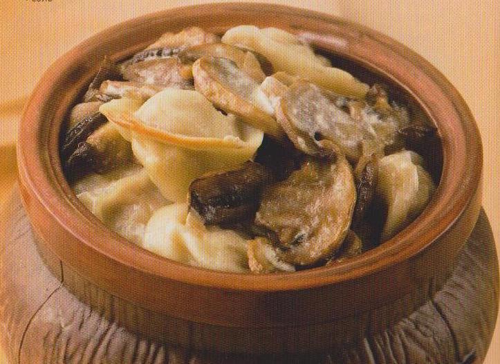 Ви можете готувати пельмені за улюбленим рецептом або купити готові м’ясні вироби. Крім пельменів Вам буде потрібно ще 300 г грибів, 100 г сиру і сметани,2 цибулини, зелень, спеції.
