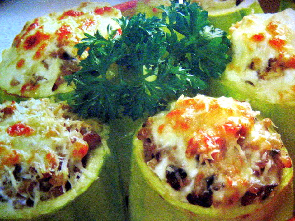 З кабачків і грибної начинки можна приготувати чудові човники, які з легкістю можуть стати прикрасою святкового столу. Візьміть кабачки з грибами в пропорції 1:2, а також: