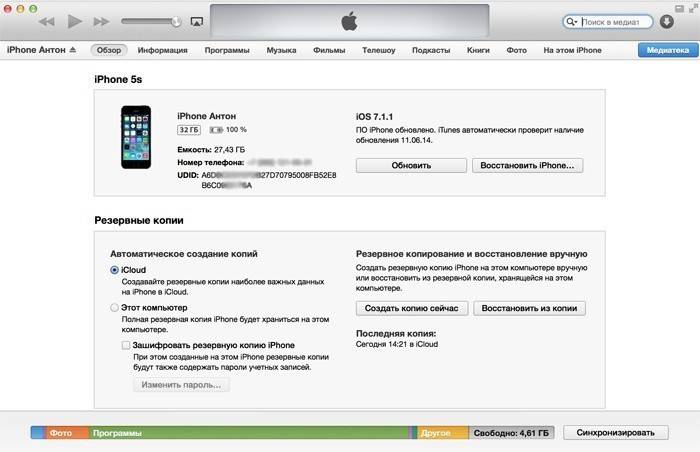 - Під’єднайте кабель свій телефон до комп’ютера, увімкніть програму iTunes. При вимкненому Wi-Fi на пристрої синхронізація з комп’ютером через нього не станеться.