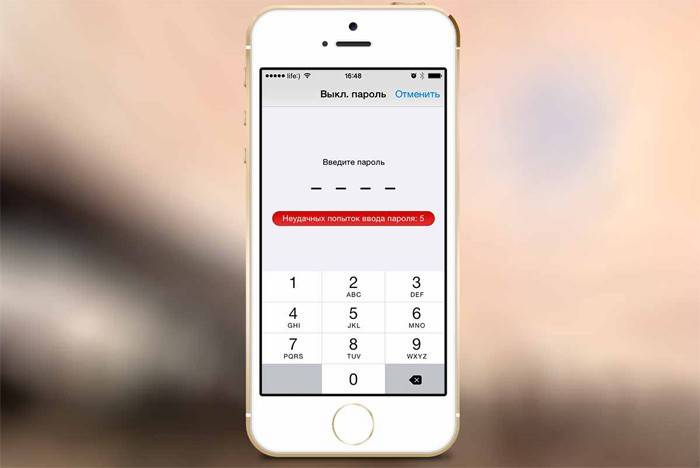 В цілях забезпечення безпеки пристрою, гаджет може заблокувати себе назовсім після шостої спроби неправильного введення пароля. У цьому випадку він видасть вам інформацію «iPhone відключений, підключіться до iTunes». У такому разі блокування може знята шляхом скидання лічильника невірних спроб. Дії того, як зняти пароль з айфона, можливі лише при наявності синхронізації з комп’ютером, його авторизації з iTunes:
