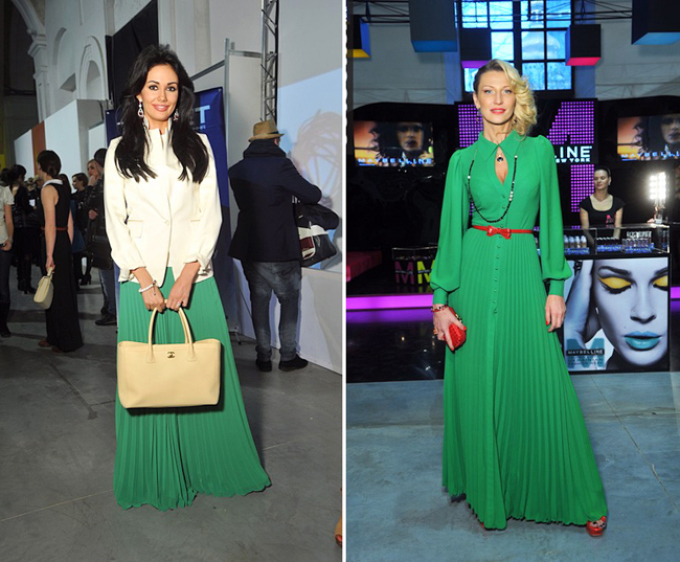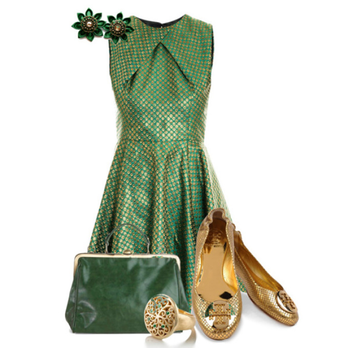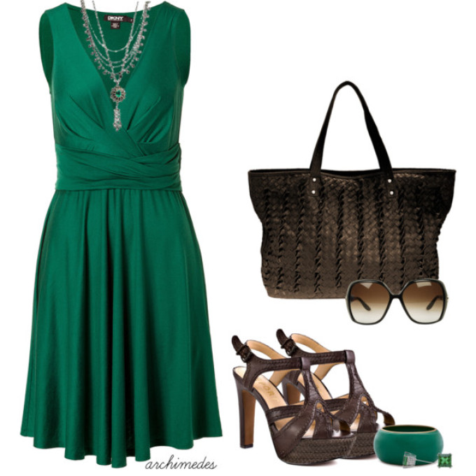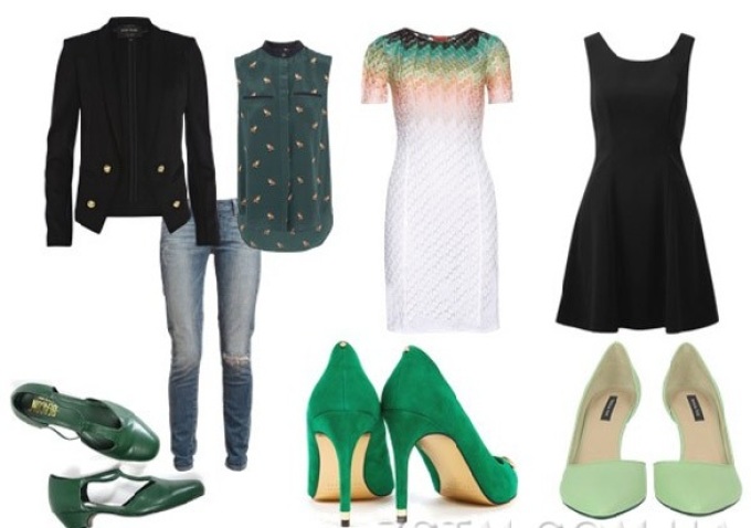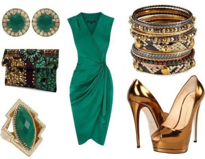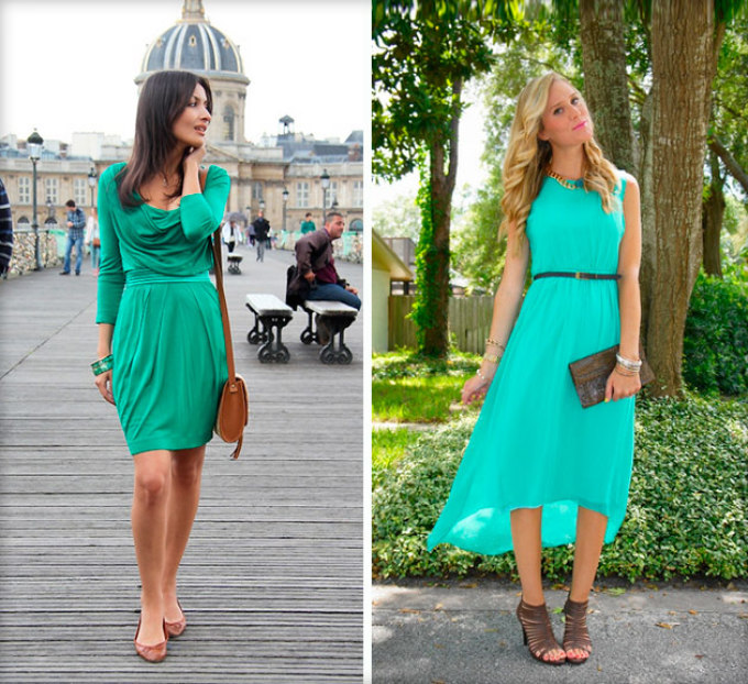 Зелене плаття – зелені туфлі! Тут все дуже просто. Головне – не перестаратися з зеленим кольором та не перетворити себе в суцільне «зелена пляма». Для цього розведіть образ масивними золотими аксесуарами, кольє і браслетів з самоцвітами, шаллю іншого відтінку. Крім того, прийнятно комбінувати разом різні тони зеленого кольору: насичені та тьмяні, світлі і темні, холодні і теплі.