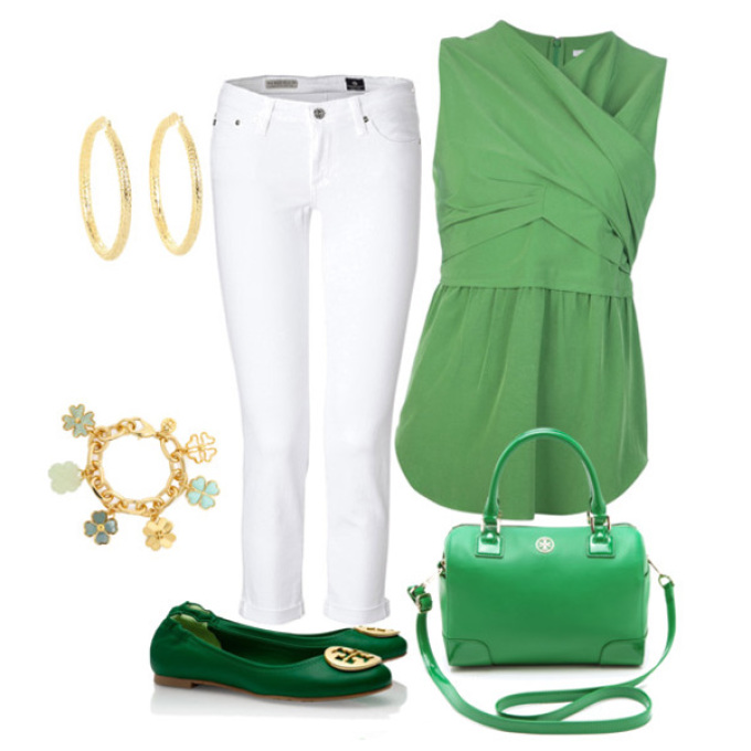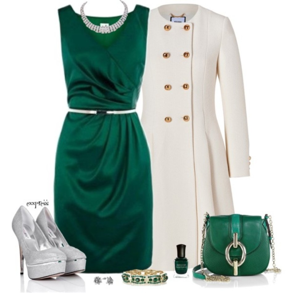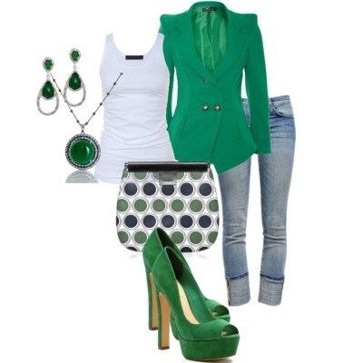 Смарагдове плаття — білі туфлі! Важливо знати, що крім взуття, в образі так само повинен бути білий колір. Наприклад, піджак, ремінь, сумочка білого кольору. Такий гардероб можна вдало поєднувати з прикрасами з сріблення, прозорими кристалами або перлами.