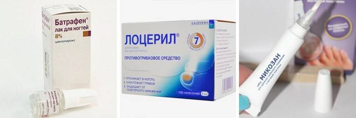 - Циклопироксоламин — антимикотический лак. Наноситься поверх ураженого нігтя через добу один раз. Перед застосуванням лаку видаляють уражену частину нігтьової пластини за допомогою пилки, що входить в комплект з препаратом. Тривалість терапії залежить від ступеня розвитку хвороби.