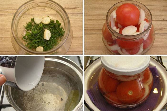 - Зверху викласти помідори. Коли банку заповниться, приступити до приготування маринаду.