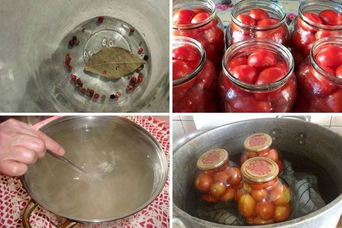 - Отриманим маринадом залити помідори. Консервацію простерилізувати, попередньо накривши кришкою (не більше чверті години).