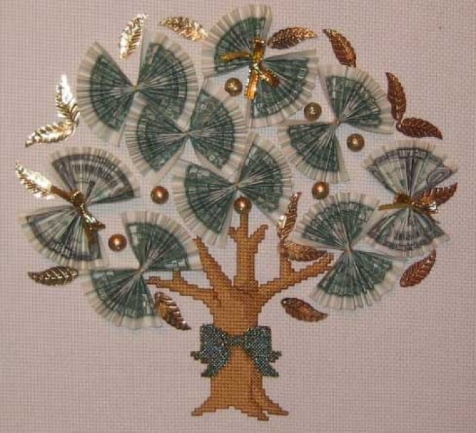 ЦІКАВО: Ще один популярний спосіб зробити «грошове дерево» — вишити його хрестиком на спеціальній тканині і потім прикрасити за допомогою купюр і інших елементів. Такий оберіг можна вішати на стіну як картину.