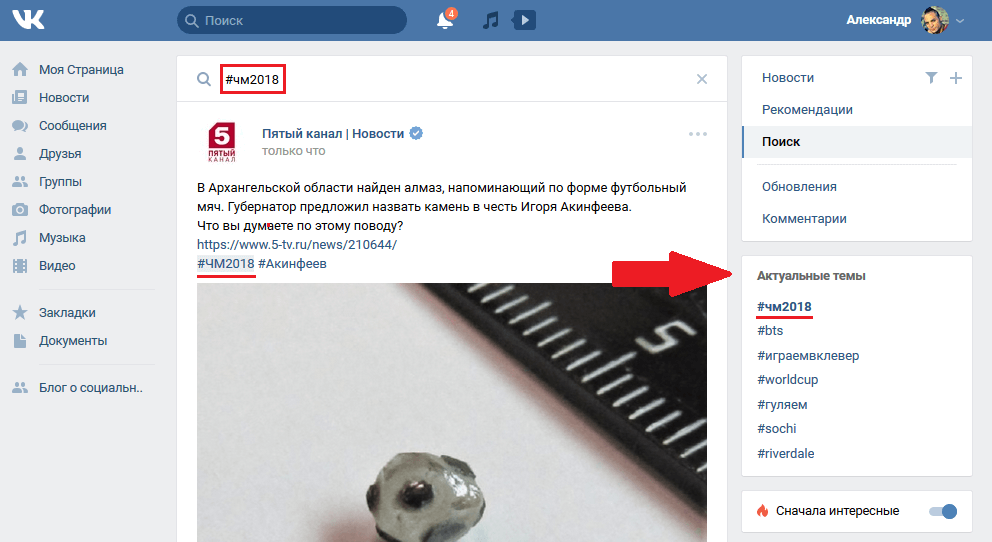 Визначитися з трендами можна на сторінці «Новини». Вам потрібно просто перейти до розділу «Пошук» праворуч і подивитися на блок «Актуальні теми». Тут показується список хэштегов, які дуже популярні.