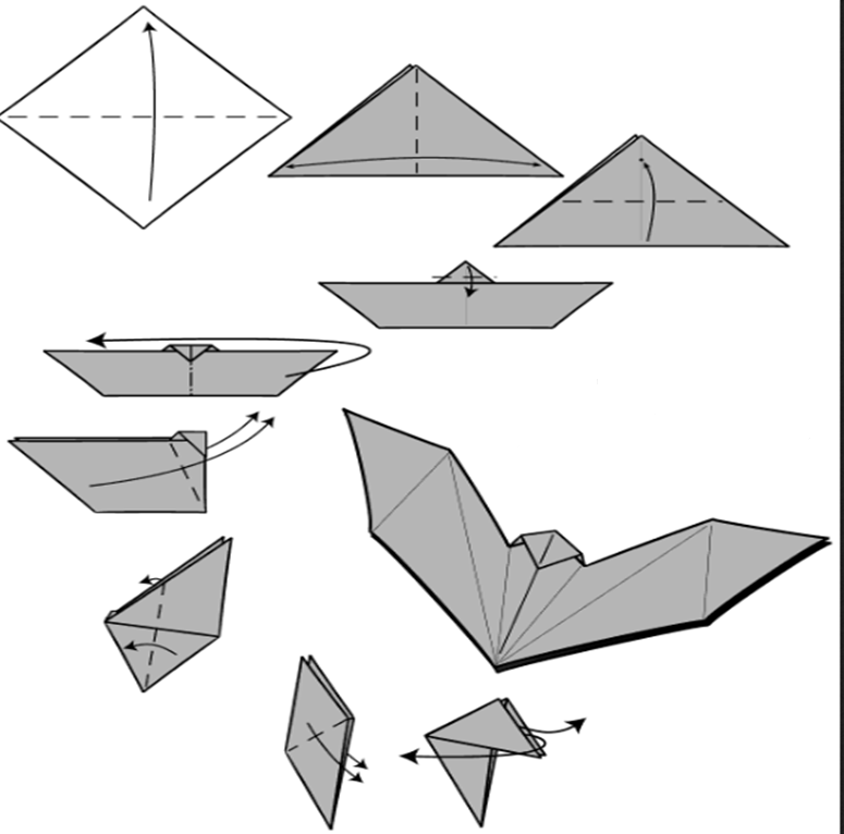 Існують різні оригінальні схеми виготовлення летючої миші з паперу. Але для переходу виготовлення складніших виробів, слід придбати перші навички, за допомогою наведених вище схем.