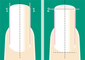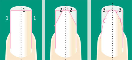 - підпилюють боковушки нігтів так, щоб вони формували гострі кути у серединних точках