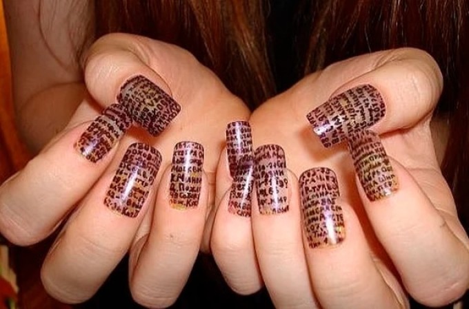 ВАЖЛИВО: Однак техніка нанесення такого манікюру у випадку зі шпаргалками не підходить. У результаті виходить дзеркальне відображення букв. Що, природно, незручно.