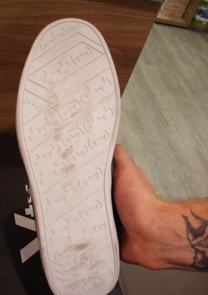 Хлопцям можна наклеїти шпаргалку на підошву взуття. Правда, така шпаргалка при ходьбі її власника може бути помітна. Якщо не хочеться так ризикувати, можна вирізати формули або терміни на підошві. Знову ж таки, потрібна та взуття, яку не шкода буде псувати таким чином.