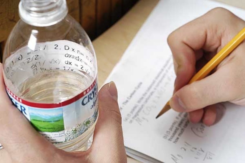 На іспити найчастіше дозволяється проносити з собою воду або сік. Можна обіграти цей момент, вирізавши в порожній коробці з-під соку віконце для шпаргалки. Особливо винахідливі студенти наносять текст прямо на етикетки пляшок! Звичайно, бажано нанести не вручну ручкою, а надрукувати на шматочку паперу, видавши її за етикетку. Подібна шпаргалка не кинеться в очі.
