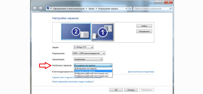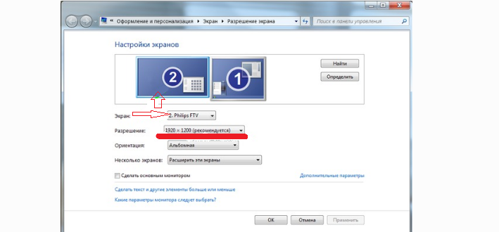 • Натисніть на монітор «2» — це ваш телевізор і виберіть дозвіл 1920х1080 і вище, якщо ваша техніка підтримує такий дозвіл. Потім клікніть на активне посилання «Додаткові параметри», яка знаходиться праворуч, трохи нижче.