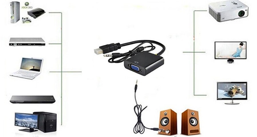 Тому, якщо не хочеться возитися з декількома каналами, і не шкода переплатити трохи грошей, краще купити адаптер HDMI-VGA-MiniJack. До нього можна підключити колонки і тоді з передачею звуку не буде проблем.