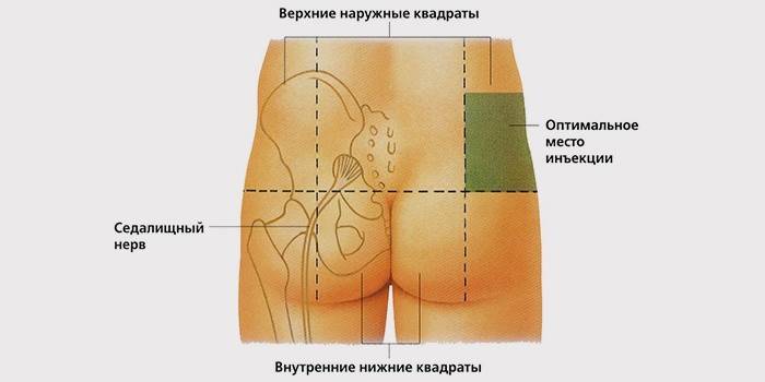 Самий хвилюючий питання після підготовки шприца – як правильно ставити укол в сідницю. Заборонено робити ін’єкцію, не обозначившись з місцем введення голки. Щоб правильно зробити укол, необхідно з допомогою уяви розділити сідницю на чотири рівні частини. Введення голки потрібно виробляти в квадрат, який знаходиться ближче до краю. Це дуже важливо: якщо колоти в будь-яке інше місце сідниці, то можуть бути такі наслідки: