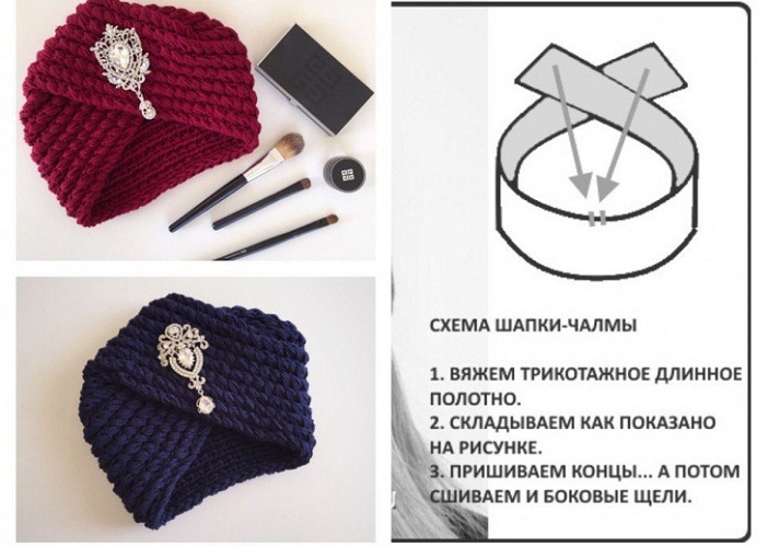 В основу в’язки покладено простий шарф. Схему ви можете взяти будь-яку, але гумка (будь-яка) більш вдало буде виглядати. Тим більше, вона буде щільно формувати саму форму виробу. Пропонуємо вам простий варіант формування чалми з в’язаного полотна.