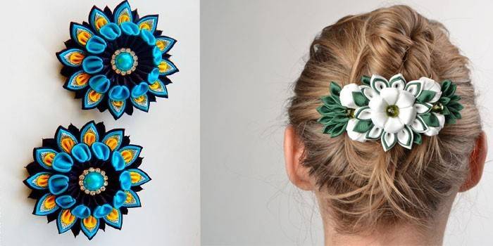Для виробів в японському стилі канзаші деталі (пелюстки) створюють з квадратів шовкової, атласної тканини. Склеюють або зшивають їх між собою. Основні види пелюсток: гострий і круглий. З них формують об’ємні квіти, декоративні елементи, композиції. Ялинку в стилі канзаші роблять з картонним або пінопластовим підставою. На пінопласт елементи кріплять кравецькі гвоздиками.