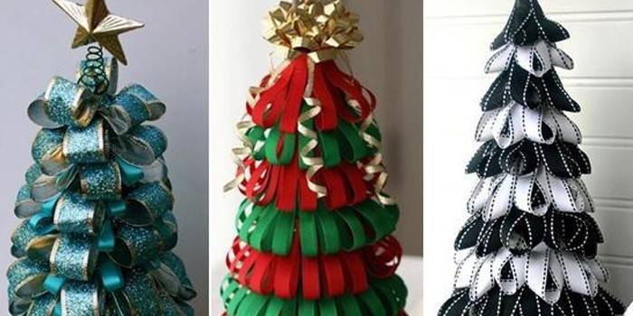 Виготовити ялинку з стрічкових петель по силам і дитині. Конус роблять з картону або пінопласту. До першого матеріалу заготовки кріплять на клей, на другий – зручно фіксувати швацькими шпильками. Красиво, ошатно виглядають вироби з атласних стрічок.