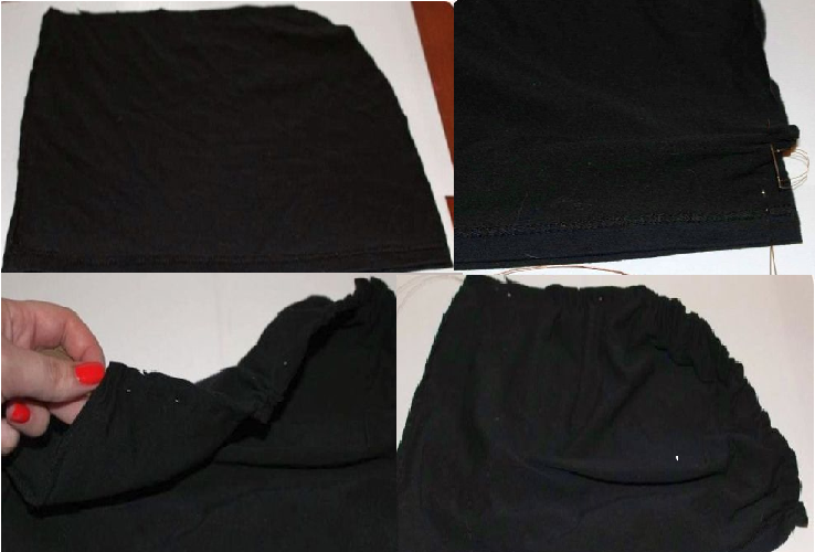 - Змітайте верхній і бічний край, а потім прострочіть. Врахуйте, що нитку при цьому не варто відрізати. Вона ще знадобитися, щоб стягнути виріб для утворення складок. До речі, зручніше проводити цю маніпуляцію прямо під лапкою швейної машинки.