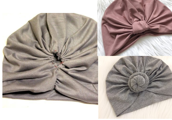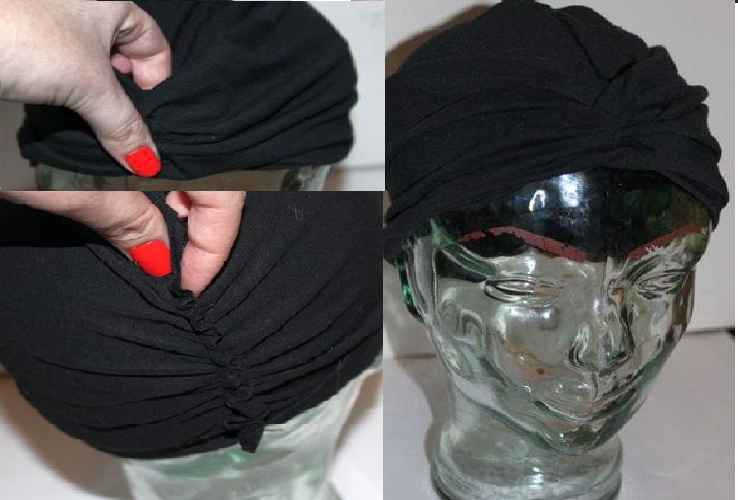 На замітку: За таким принципом ви можете зробити шапку-чалму з обідком. Для цього потрібно лише прострочити пов’язку, що дорівнює обхвату голови, до зібраної основі. Також можна пустити і контрастні хустки для прикраси.