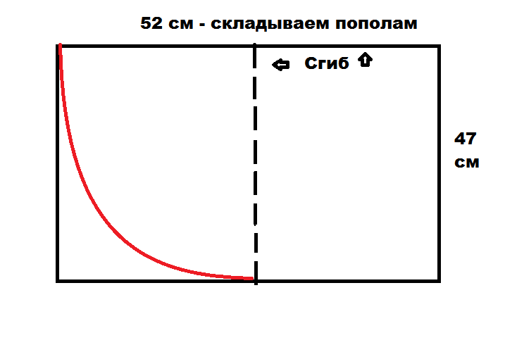 - Якщо у вас занадто тонка тканина, тоді складіть її вдвічі. Але в такому разі довжини виробу потрібно брати в 2 рази більше (47*2). Далі, як показано на схемі нижче, складаємо тканину по ширині також навпіл і робимо закруглення від кута до середини.