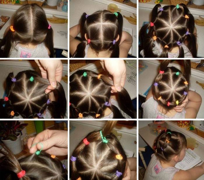 Рухомим, активним дівчатам чудово підійде варіант причеки під назвою «святковий вінок». Ця зачіска проста у виконанні і навряд чи займе більше п’яти хвилин при наявності деякого досвіду. Для її створення знадобиться вісім одноколірних або різнокольорових гумок і гребінець. Якщо це укладання на свято, аксесуари для волосся можуть бути яскравими, а якщо мама робить дитячу зачіску в школу, краще використовувати гумки одного-двох відтінків. Як зробити вінок на голові: