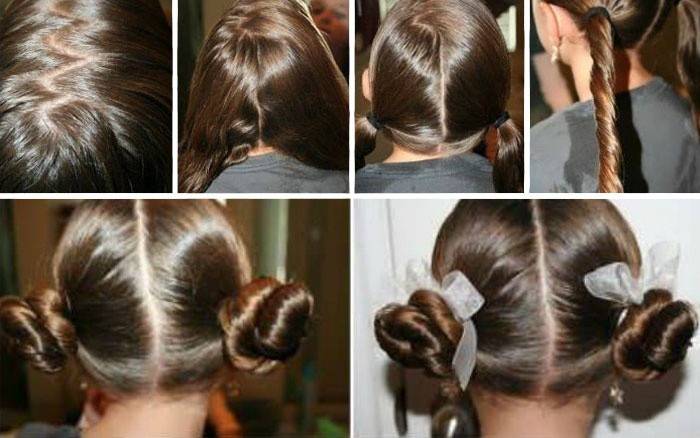 Бараночки роблять на коротких, середніх і довгих волоссі. Щоб створити стильну зачіску, потрібно зробити дівчинці два хвоста – високих або низьких залежно від бажаного образу. Додасть укладанні оригінальності зигзагоподібний проділ. Після того, як зібрані волосся, потрібно скрутити їх у щільні, тугі джгути, які стануть основою зачіски. Отримані елементи скручуються ще сильніше і обертаються навколо гумок. Поверх майже готових «бубликів» потрібно зафіксувати ще по гумці або закріпити результат шпильками. Стильна укладка в школу за 5 хвилин готова!