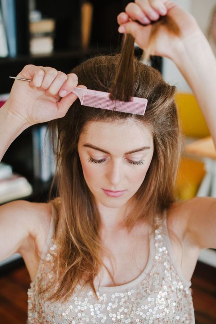 • Від проділу потрібно робити начісування, просуваючись до чубчику. Слід залишити пасма, якими в підсумку можна буде накрити зачіску.