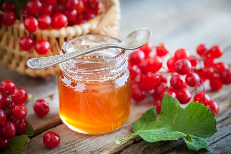 - Калина з додаванням меду. Можна використовувати свіжу, заморожену або ж навіть засушену калину в розмірі 2 ложок. Її необхідно перетерти разом з насінням і залити склянкою окропу. Після чого накрити кришкою і дати настоятися близько півгодини. Кашку процідити і додати мед. Пити потрібно всього пару ковтків за весь день, так як калина досить концентрована.